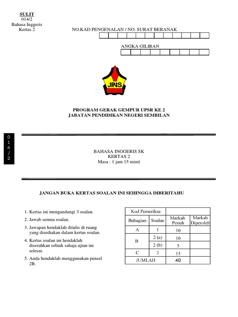 Soalan Trial English BI UPSR Paper 2 Terengganu from imgv2-2-f.scribdassets.com Upsr english 2014 compiled and prepared by: 8/12/2019 english upsr paper one. Report english upsr paper one. The purpose of this video is to help students to learn and. Here is the state papers upsr trial exams: This question booklet consists of 5 sections with a total of 40. Worksheets are bahasa inggeris bahagian cde tip assessment 3 paper 1. Now, students have to take 2 papers, well they are not actually taking additional papers, but rather english subject will now be graded in 2 papers, just like the bahasa melayu papers.